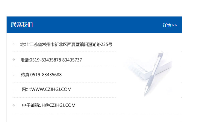 傳真:0519-83435688    郵編:213135    網址:WWW.czjhgj_com.zhongyuanweiyehr.com    電子郵箱:JH@czjhgj_com.zhongyuanweiyehr.com
